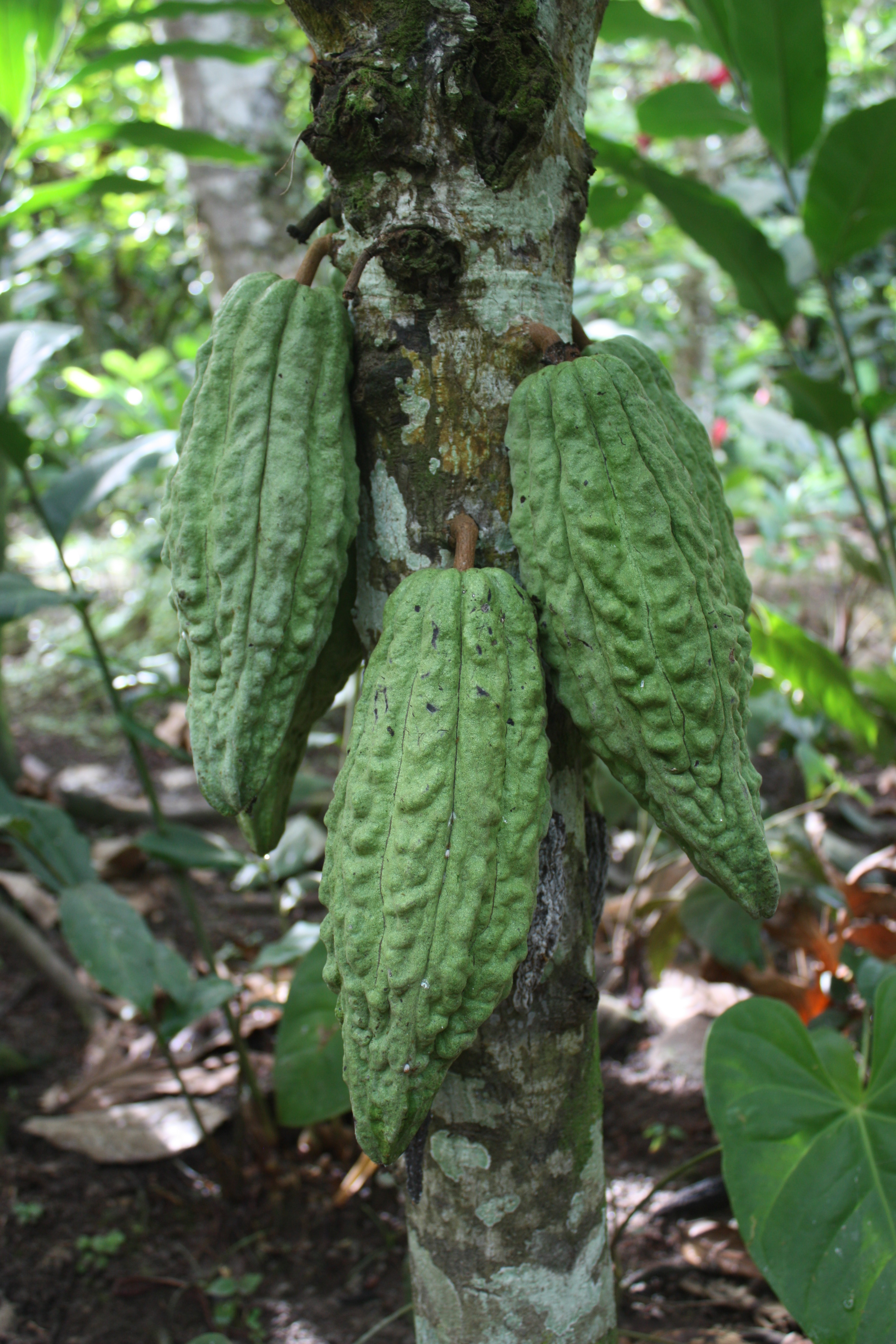 La plantation est encore en activité (ici, du cacao):