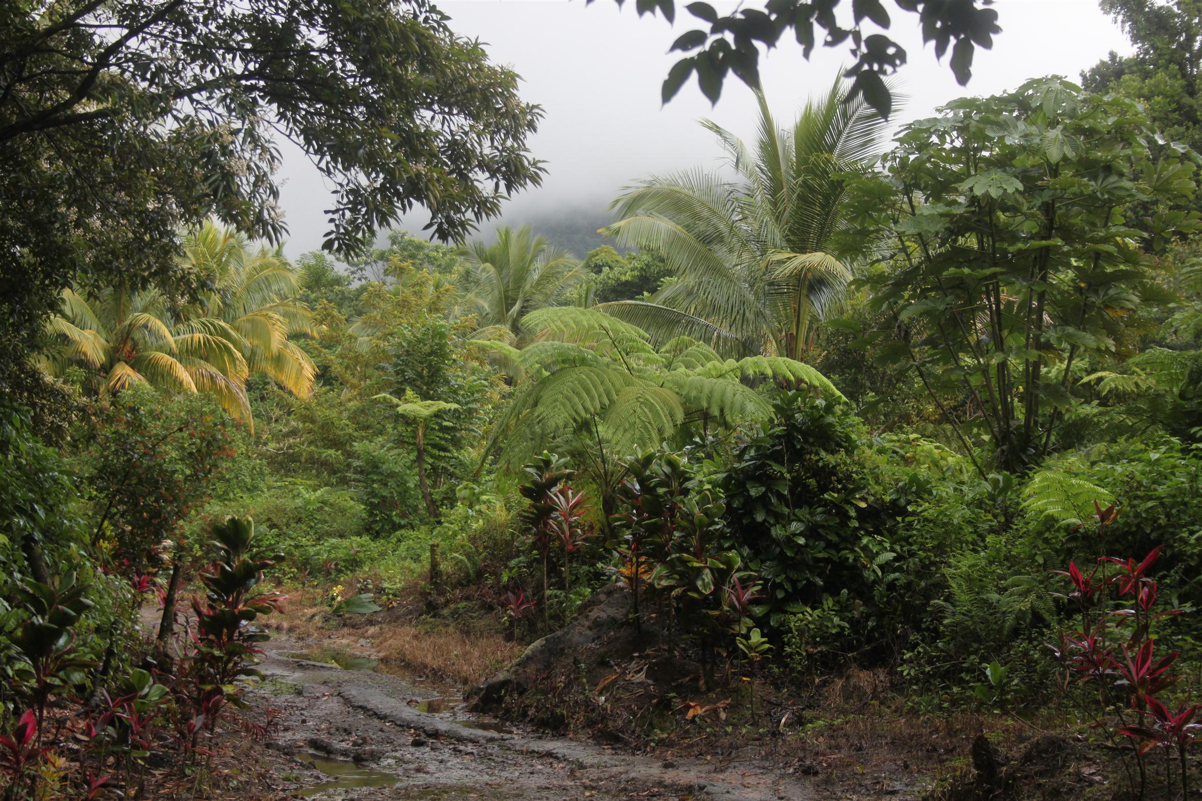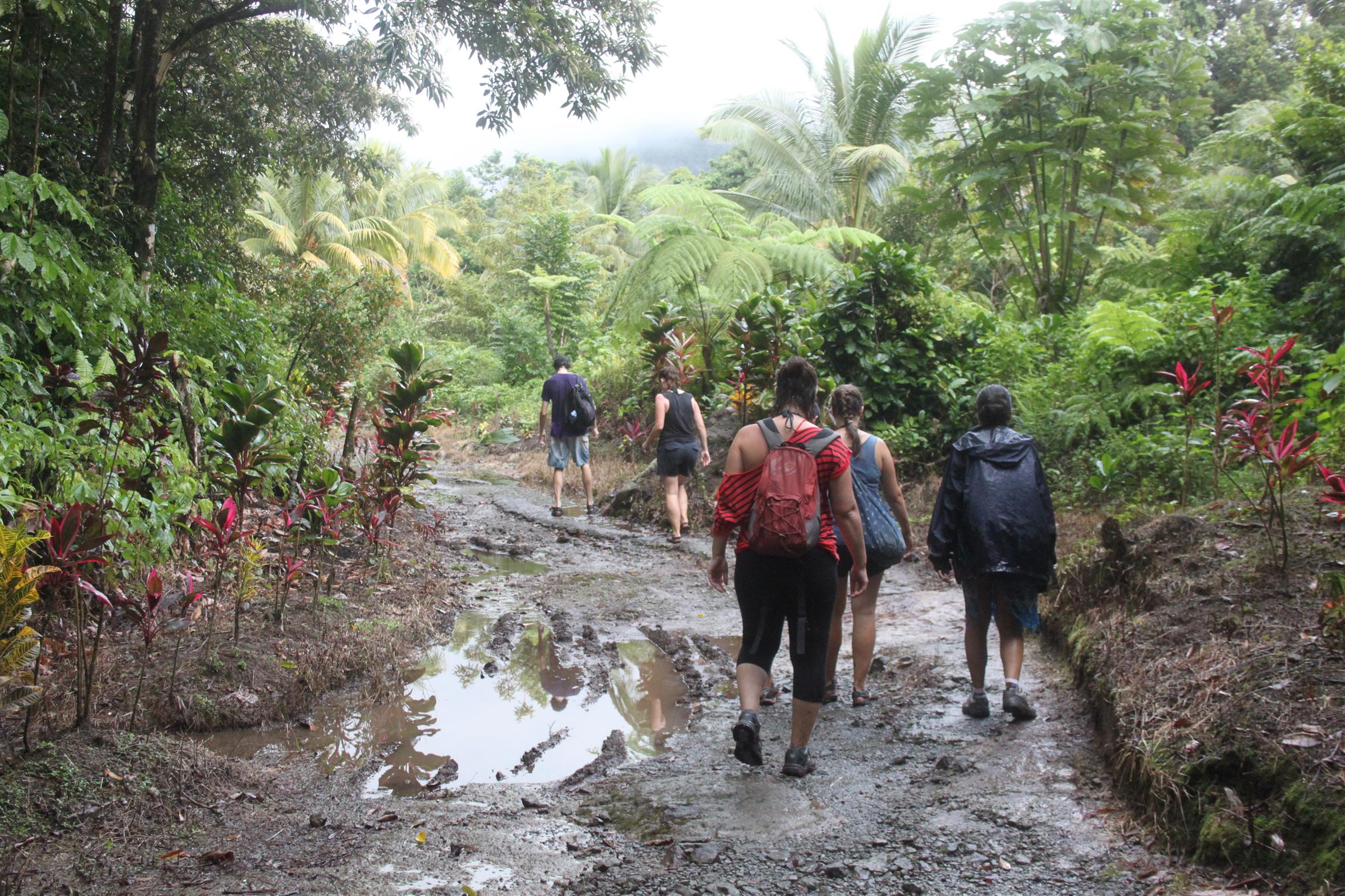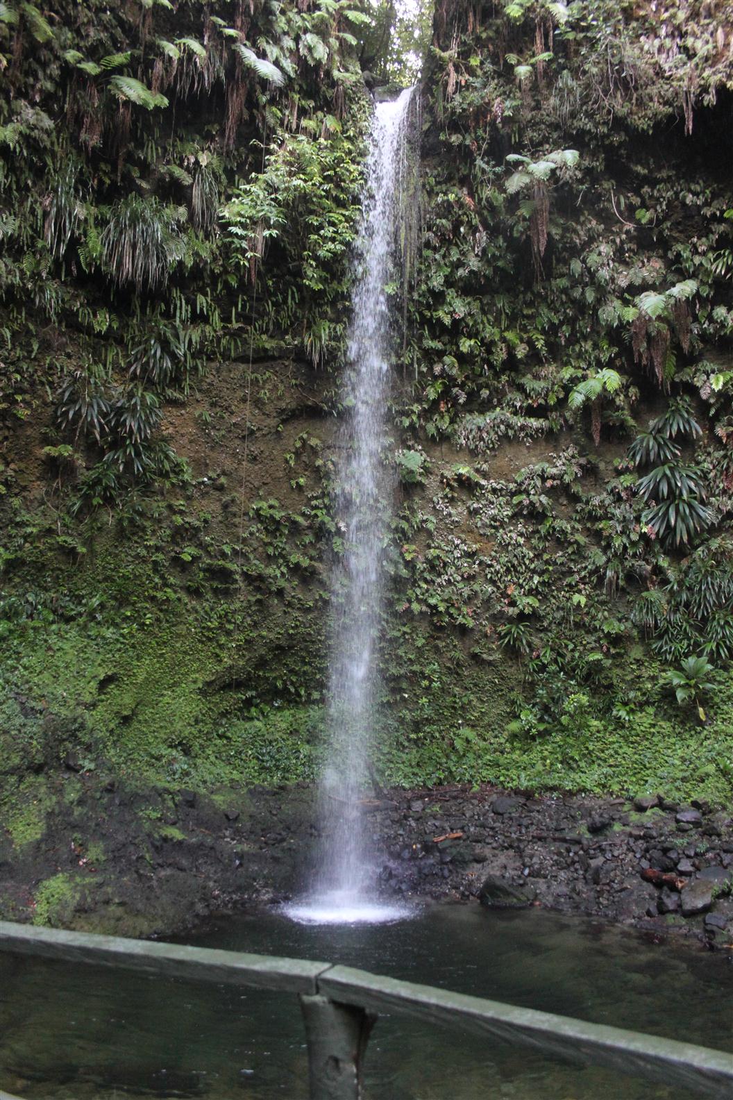 En ce dimanche pluvieux, avec un groupe d’amis, nous avons décidé d’aller voir deux cascades situées dans le centre de l’île : Spanny Falls, aussi appelées Spanny Twin Falls ou Penrice Falls. Une fois arrivé sur place, l’endroit ne paie pas de mine, juste un petit bar à l’entrée suivi d’un chemin de terre entouré de plantations de bananes.
