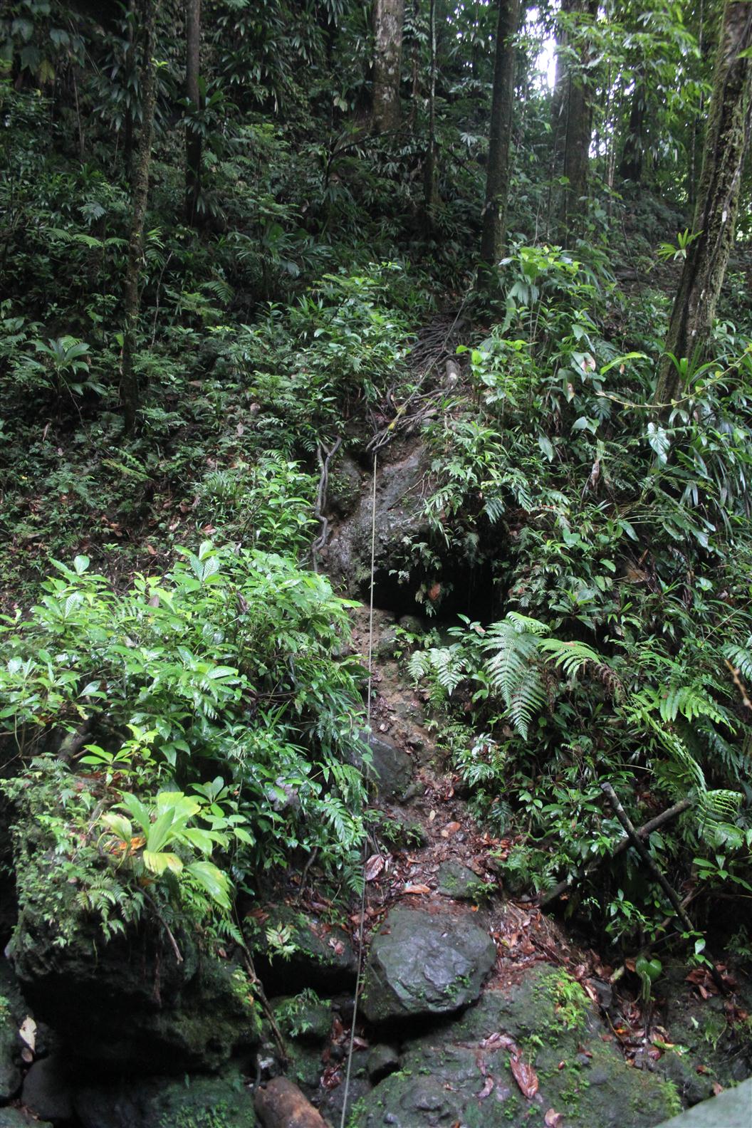 Poussé dans notre élan, on s’est dit qu’on allait d’abord voir la deuxième cascade avant de décider où se baigner (et oui nos problèmes sont assez existentiels ici!). Pour cela, il a fallu emprunter un « chemin » qui était plus proche du mur d’escalade que de la petite balade toute tranquille que nous venions d’effectuer. Avec la pluie de la journée, ce n’était que boue et rochers glissants, heureusement qu’une corde était là pour nous aider.