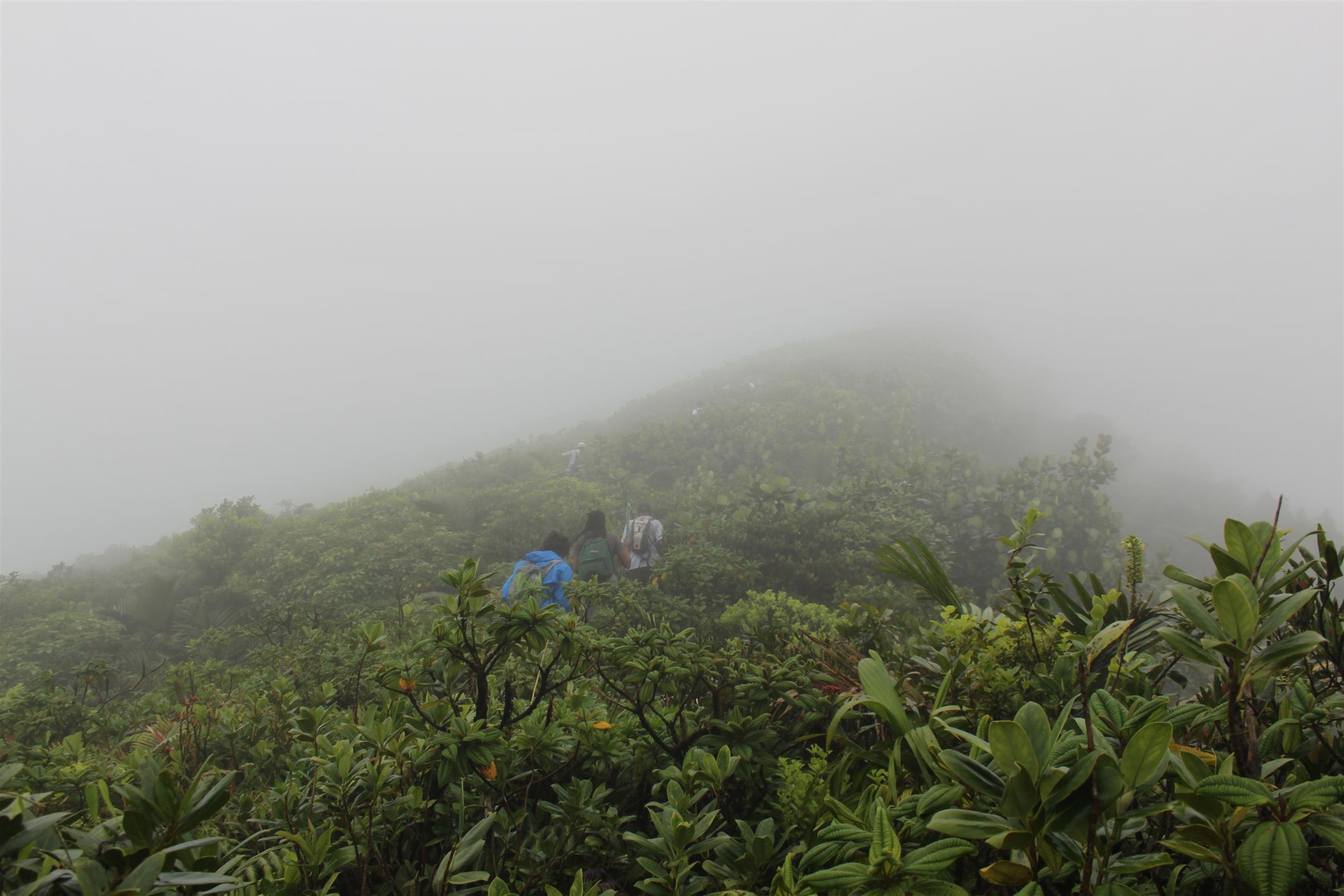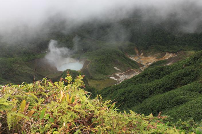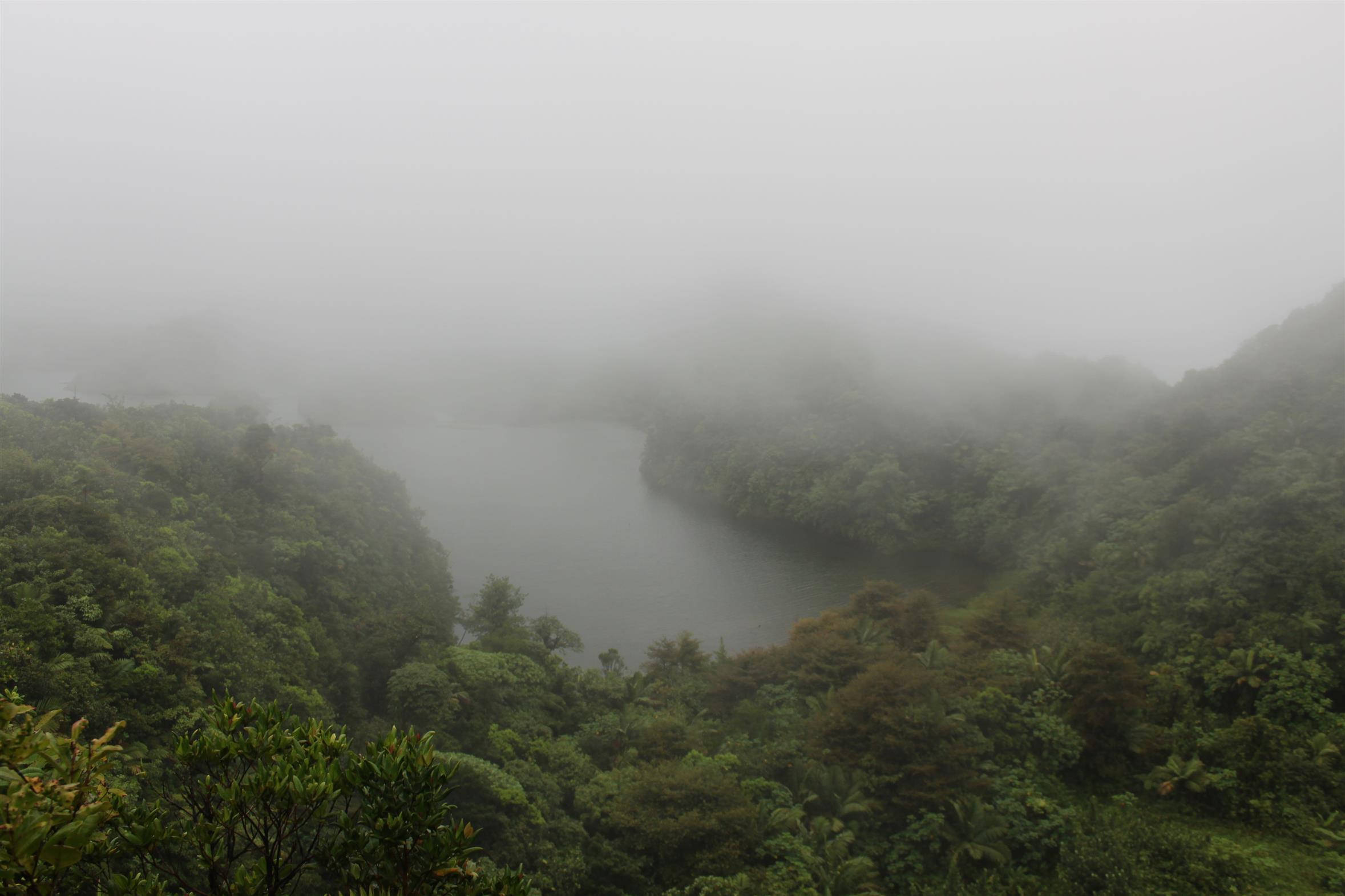 Celui-ci se trouve dans la vallée de Roseau, au cœur de la rainforest et dans un des coins les plus humides de Dominique. Il est donc régulièrement entouré de nuages, mais ce matin là nous n’avons pas de chance: il était complètement dans la brume!