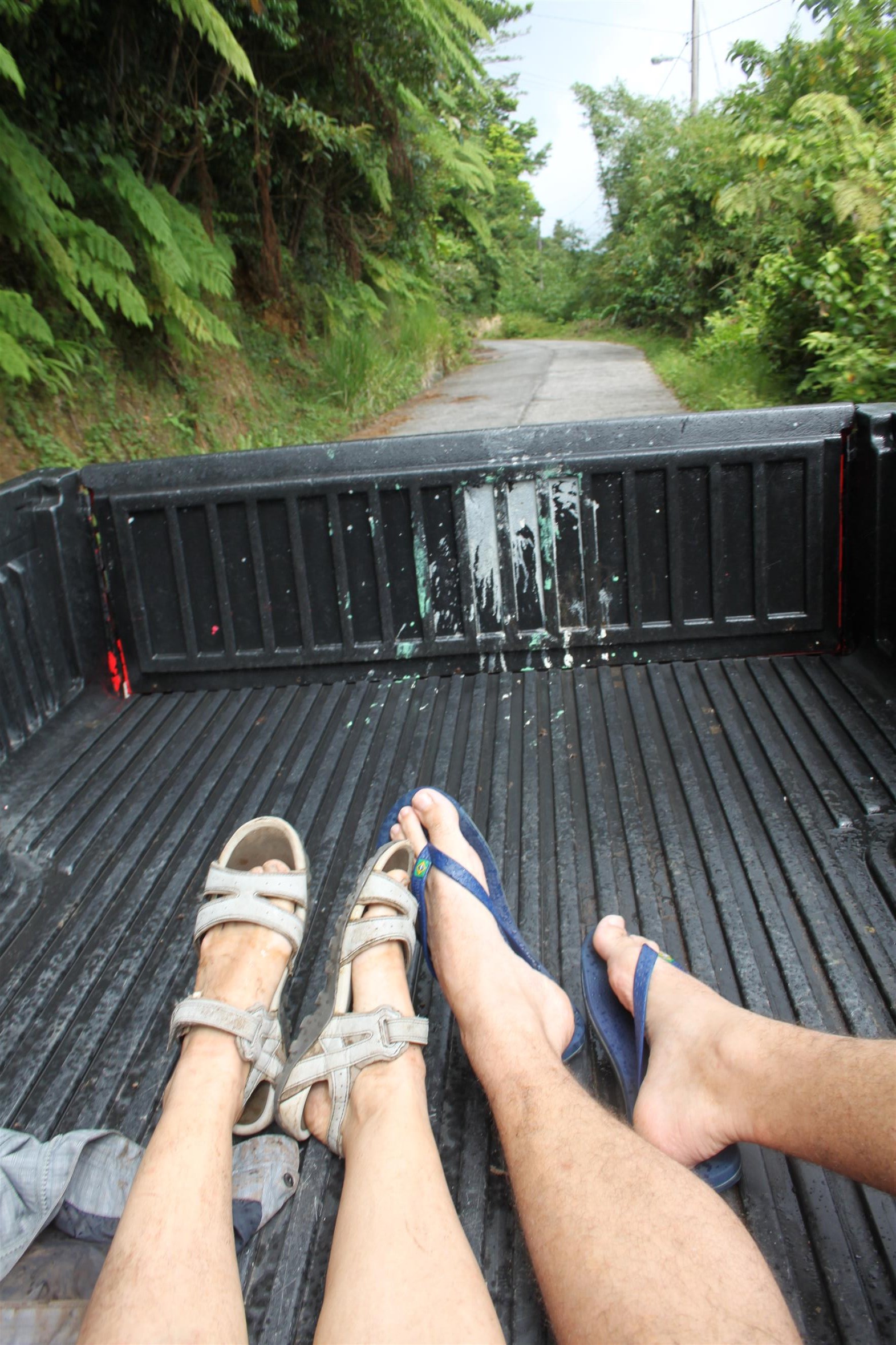 Ce week-end, nous avons rejoint un groupe de randonnée local qui organise des sorties le premier samedi de chaque mois. Au programme, une randonnée de 6h qui fait le trajet entre 2 lacs de l’île: le Fresh Water lake et le Boiling Lake. Départ à 6h du matin (outch…) de Roseau, et petit trajet d’une demi heure à l’arrière d’un pick-up pour rejoindre le Fresh Water lake.
