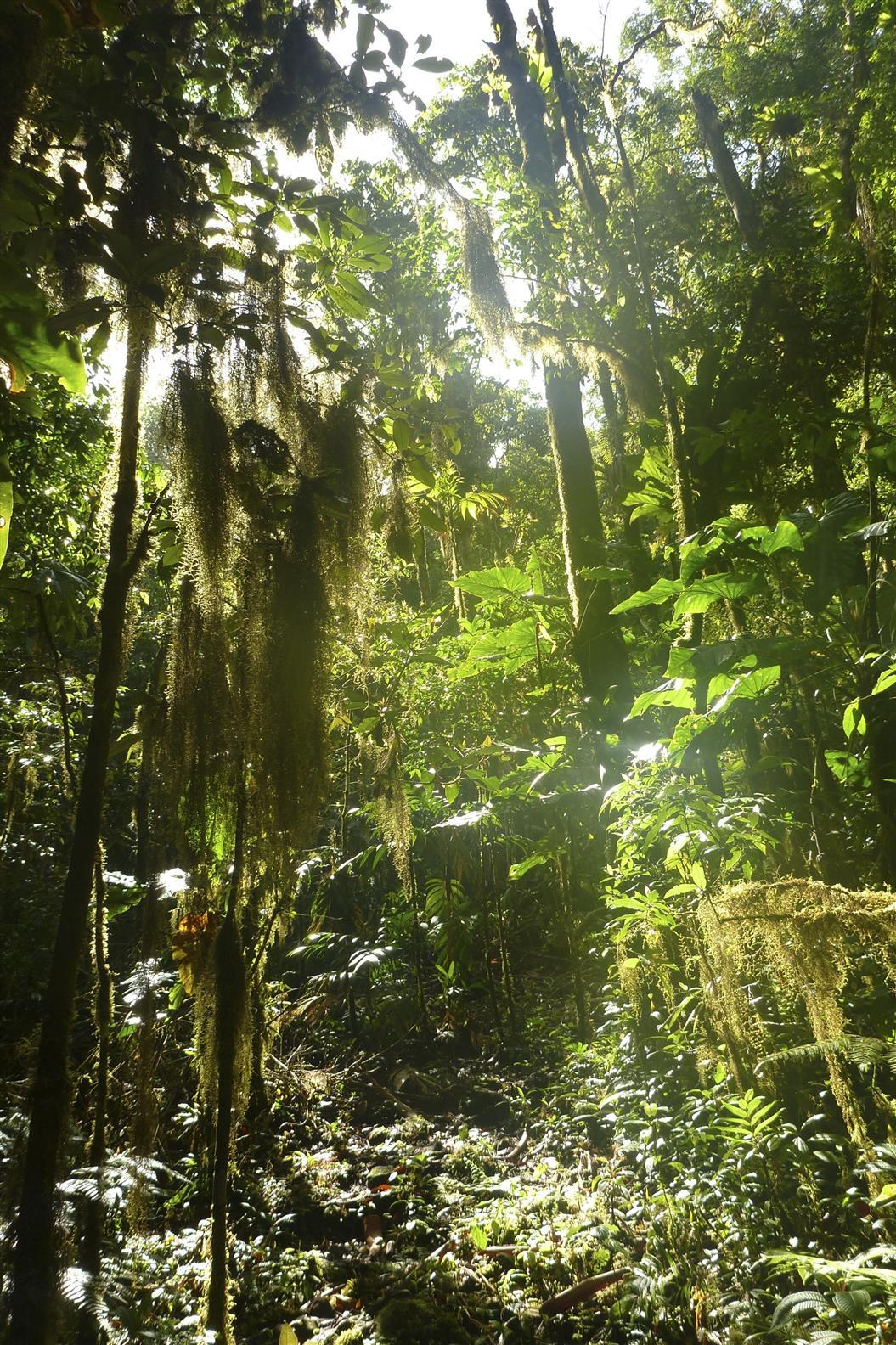 Pendant la première heure, nous sommes en plein rainforest, sur le territoire des perroquets (Sisserous et Jacos). Nous les entendons tout autour de nous mais sans en voir aucun… dommage! La fôret est très humide (mais c’est un peu le principe d’une rainforest), avec des arbres couverts de mousse et des fougères géantes.