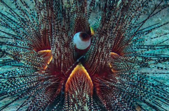 Côté plongée, c’est tout aussi spectaculaire, car la topographie extrême de l’île se retrouve sous l’eau. J’ai pu voir une très belle faune: requins, monnaies caraïbes, et un incroyable oursin magnifique (Astropyga magnifica), une bestiole que l’on trouve exclusivement dans les Caraïbes. En gros un oursin multicolore avec sur le dos une excroissance qui ressemble de façon très dérangeante à un oeil humain…