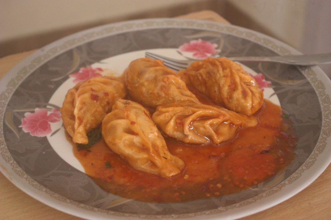 J’y commande à manger quand j’ai la flemme de cuisiner (ce qui arrive souvent). Il faut dire que les plats ne coûtent à peu près rien, sont absolument délicieux, et pour courronner le tout peuvent être livrés à domicile. Quand on connait mes compétences culinaires, on voit mal pourquoi se priver. Pour vous donner un exemple, voilà un plat de momos (raviolis tibétains), à 50 roupies (toujours 50 centimes d’euro, car en Inde on en a généralement pour son argent).