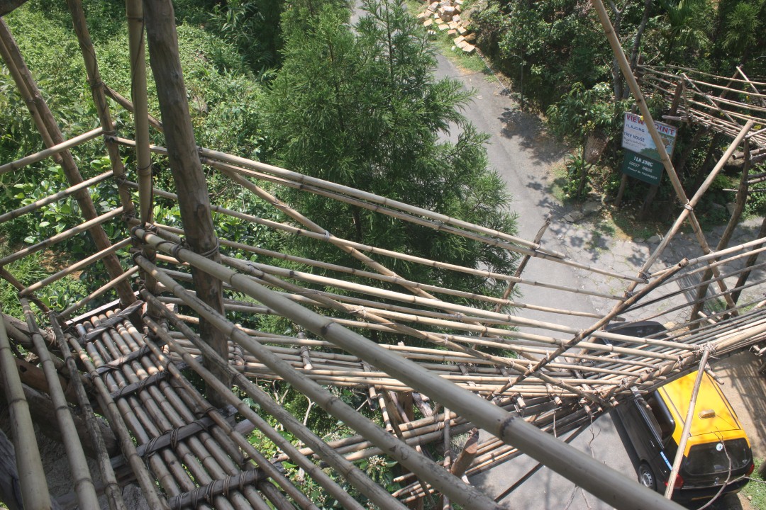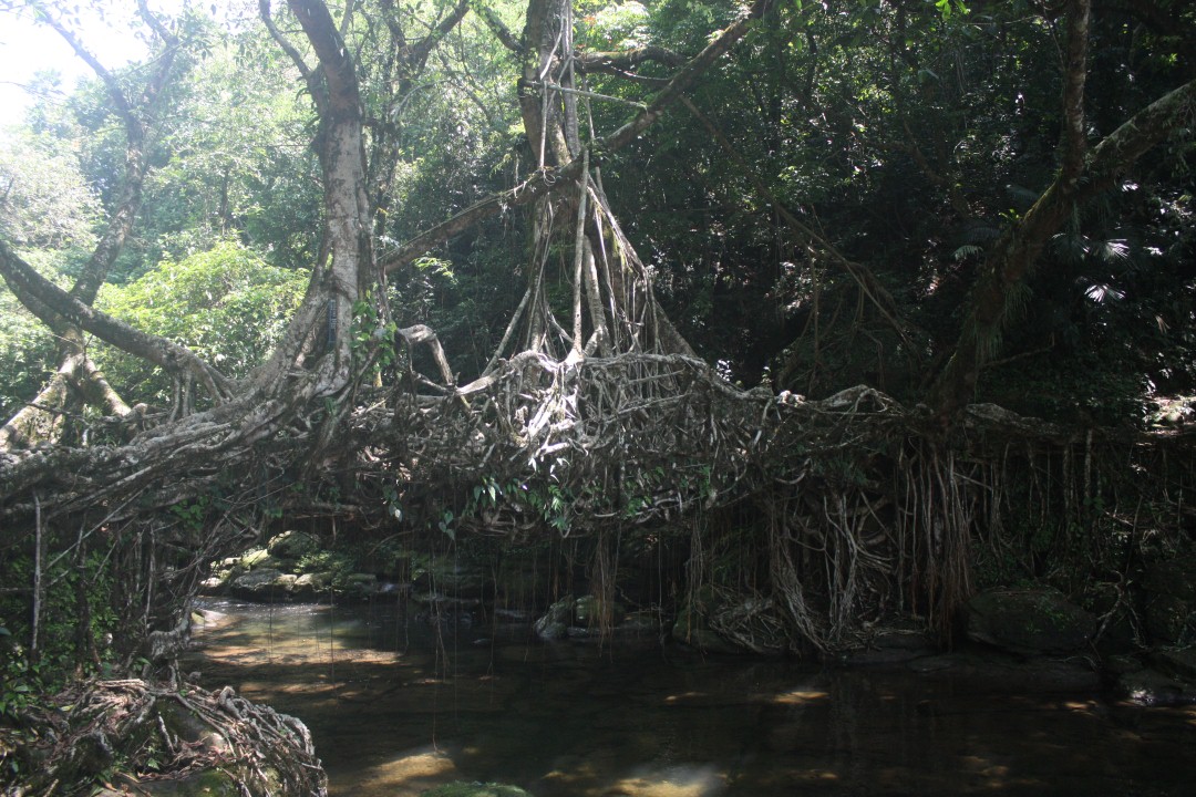 Ces ponts sont uniques au monde (parait-il) et ont été créés par les Khasi selon un système d’ingéniérie naturelle: les racines d’arbres poussant au bord des rivières (Ficus elastica et Ficus benghalensis) sont entralacées horizontalement au fur et à mesure qu’elles poussent pour créer progressivement un pont. Comme ces ponts sont vivants et continuent de grandir ils se renforcent et se réparent seuls, avec le temps…