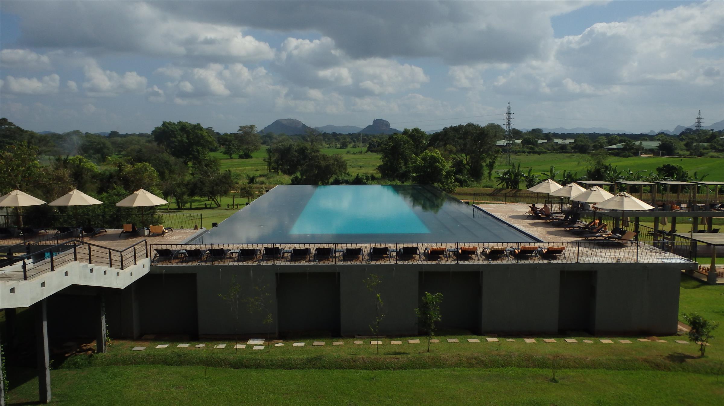 Nous avons tout de suite piqué une tête dans la piscine, qui avait plus la taille d’un lac que d’un bassin normal. Au loin, on peut voir le rocher de Sigiriya, dont la visite était l’objectif principal de notre séjour ici: