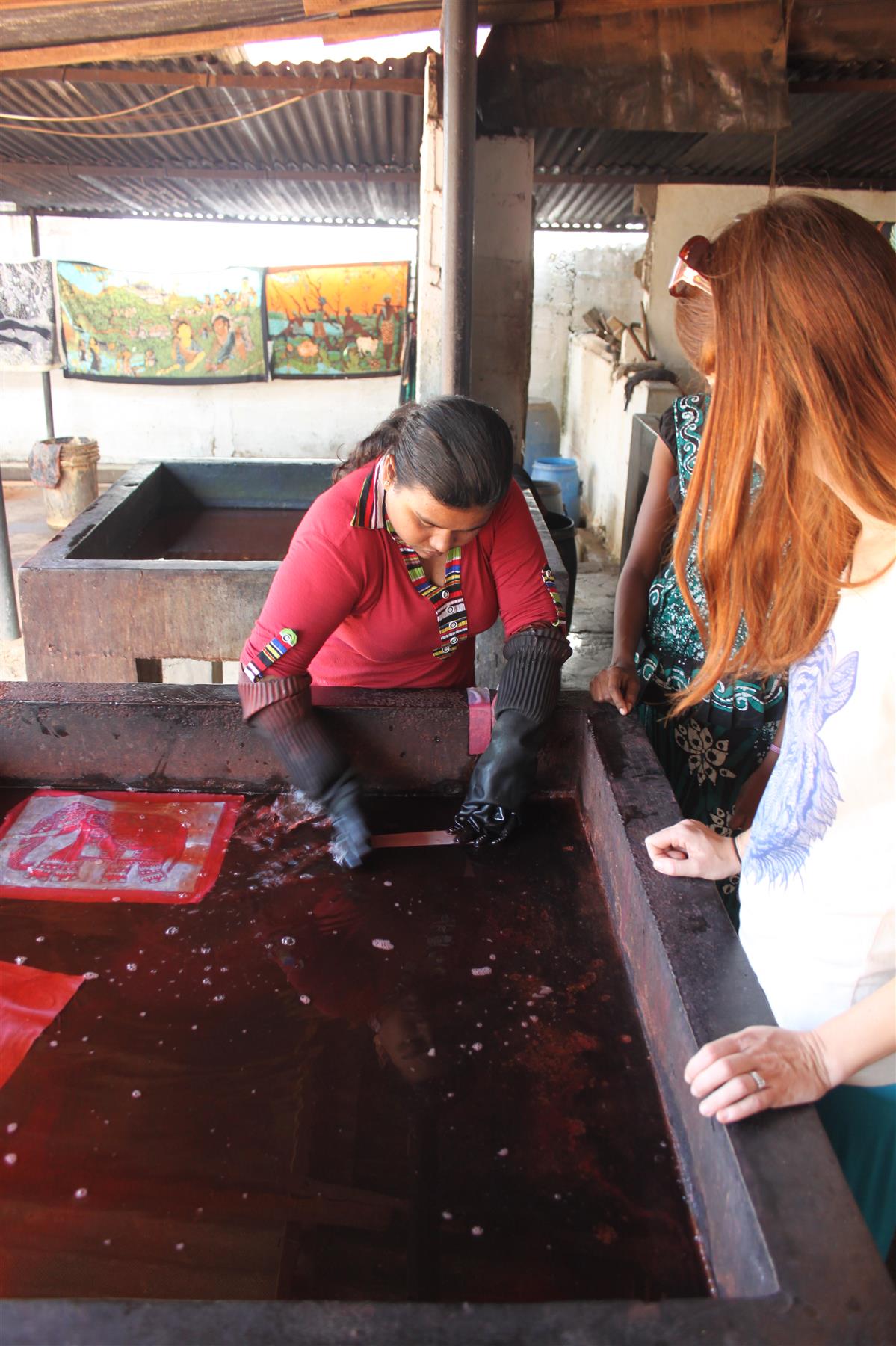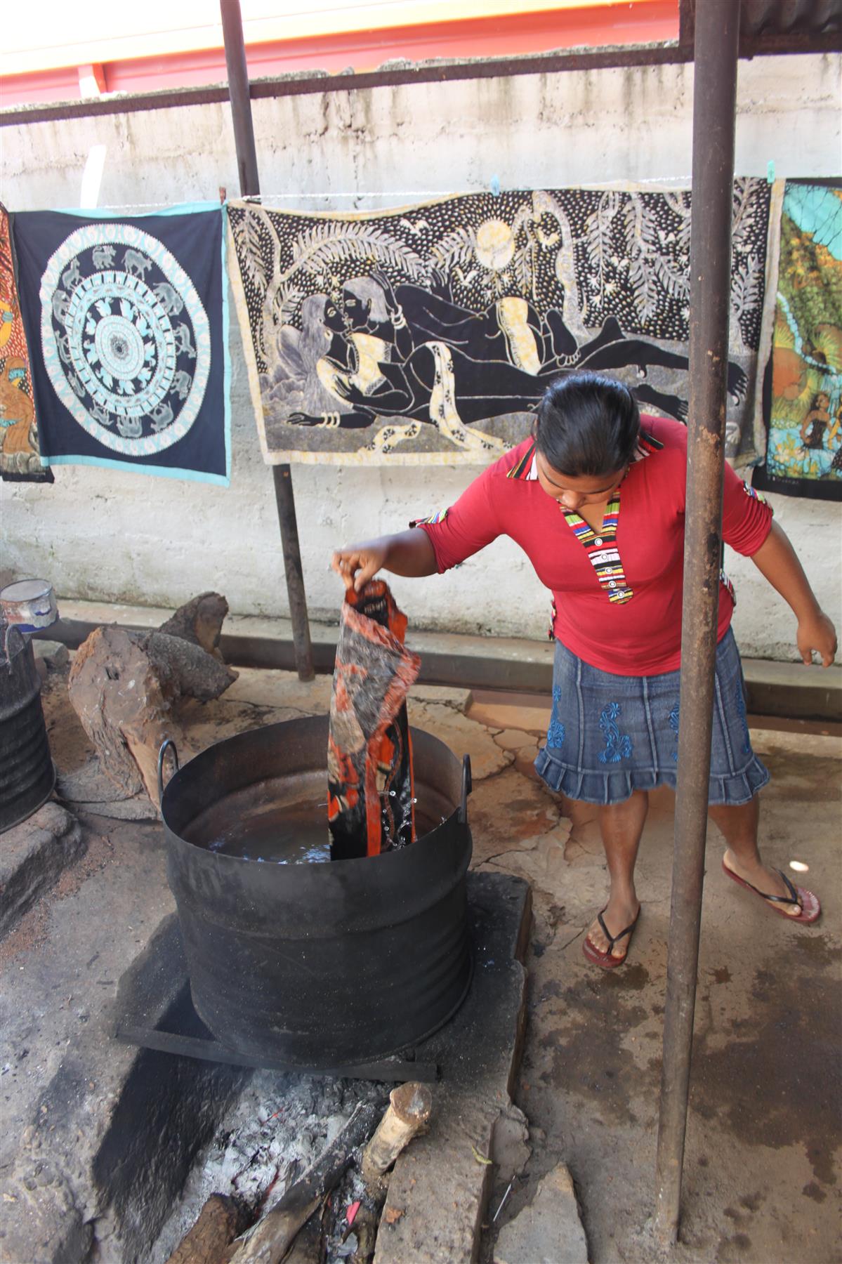Une fois la partie désirée teintée, l’artisan enlève la cire en trempant le tissu dans de l’eau bouillante :