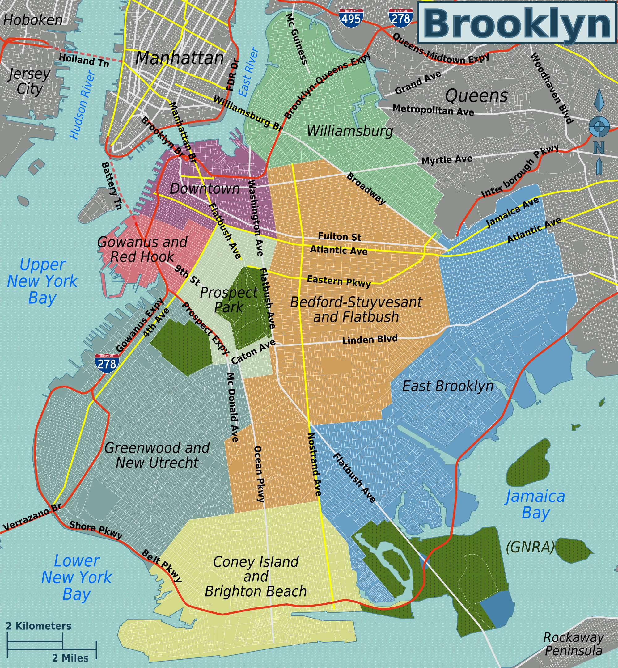 - Brooklyn: 2,6 millions d’habitants. Brooklyn est un quartier à tendance résidentielle et l’arrondissement le plus peuplé de la ville. Il est aujourd’hui de plus en plus populaire et branché. On y trouve une des rares plages de la ville, au sud.