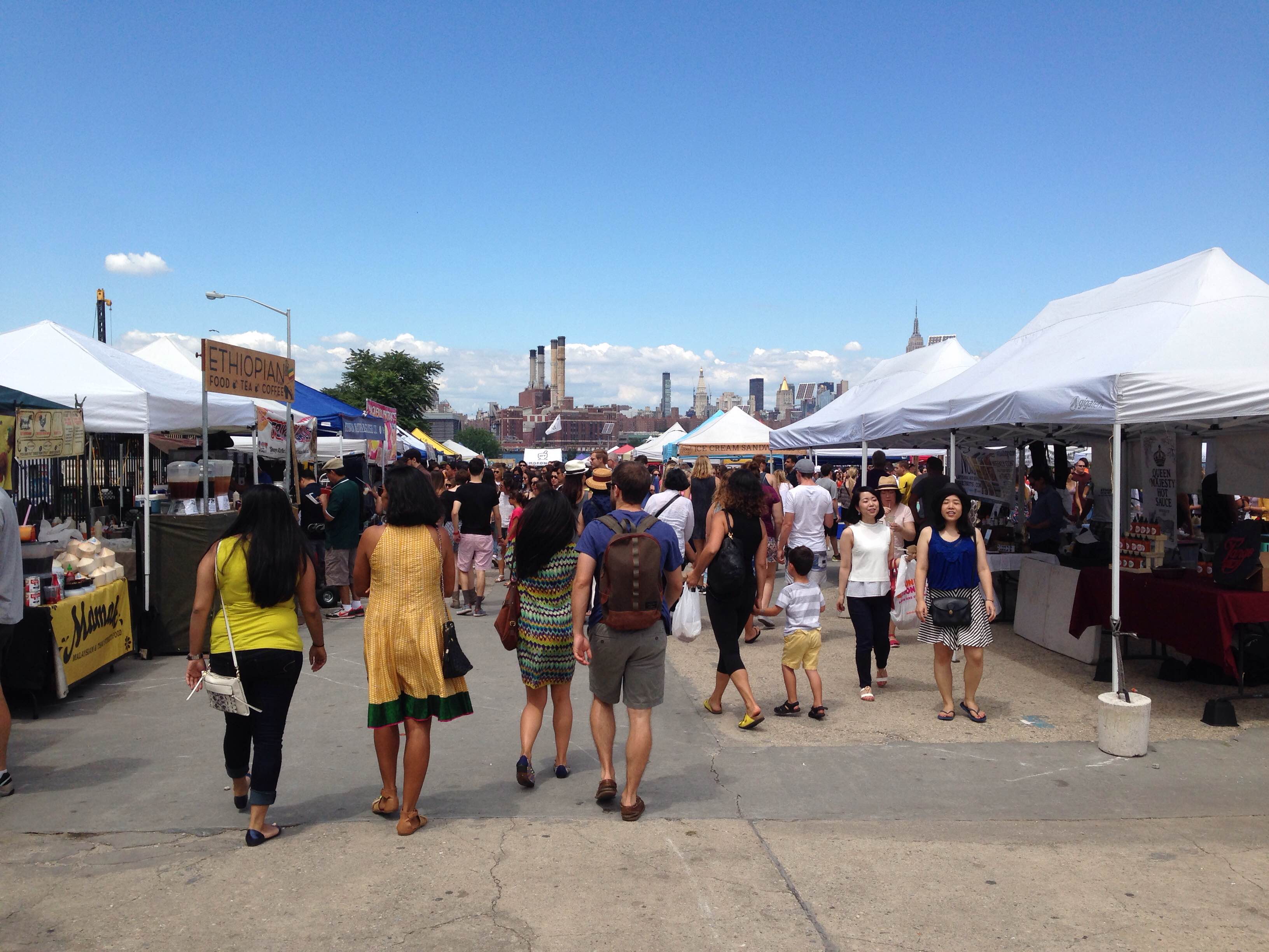 Après une petite balade dans les environs, nous sommes allés au marché de Smorgasburg, dont nous avions beaucoup entendu parler. C’est un street food market qui a lieu le samedi à Williamsburg entre avril à novembre, et qui accueille une centaine d’exposants de New York ou des alentours. Le site est superbe, au bord de l’east river et avec vue sur Manhattan:
