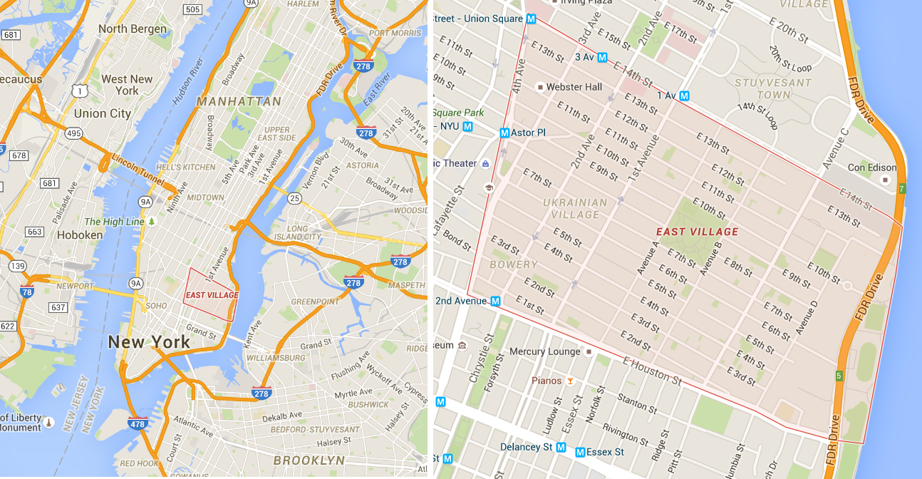 Le principal quartier de l’East Village est connu des New Yorkais sous le nom de « alphabet City ». C’est en effet le seul quartier de New York où les avenues sont nommées par des lettres au lieu de chiffres.