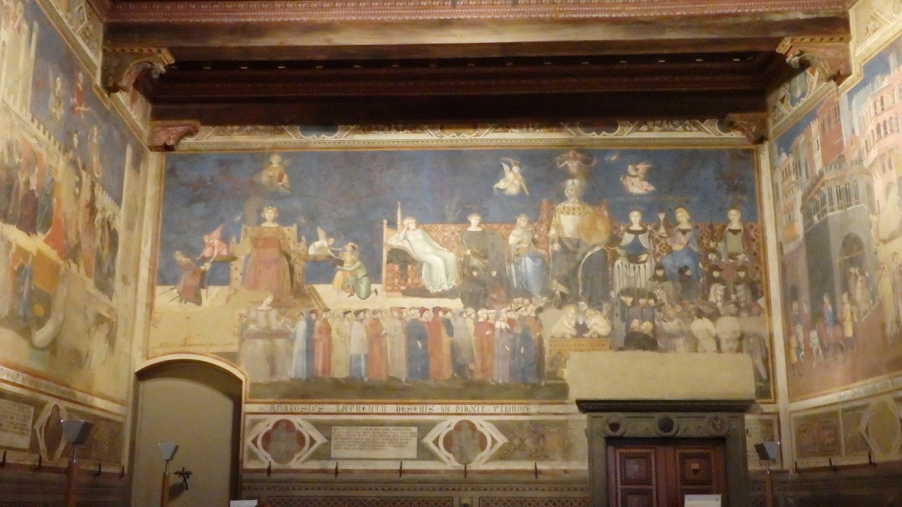 La pièce la plus importante est la Salle des Neuf, du conseil de 9 citoyens qui s’y réunit entre 1287 et 1355. Elle abrite une célèbre fresque d’Ambrogio Lorenzetti des Effets du bon et du mauvais gouvernement, peinte à partir de 1338 (et à qui mon appareil photo ne rend pas du tout justice).