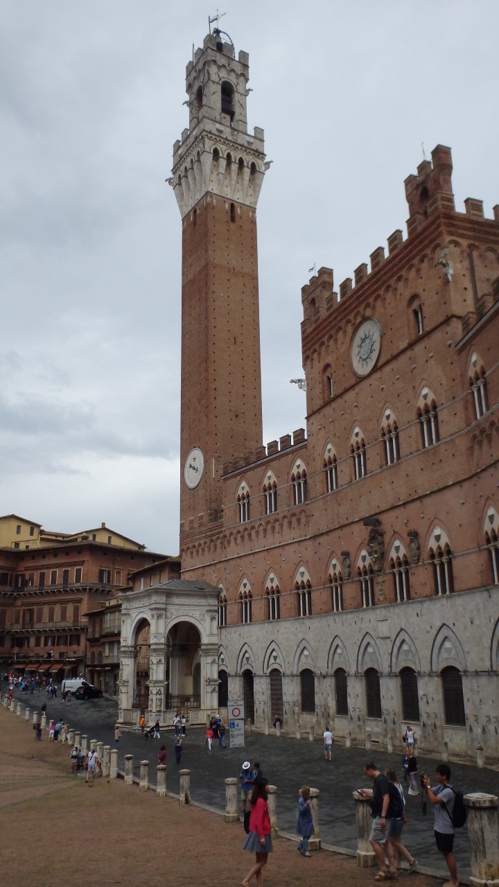 La place est bordée par un grand édifice gothique, le Palazzo Pubblico et sa tour (Torre del Mangia):