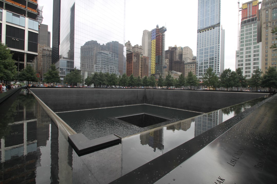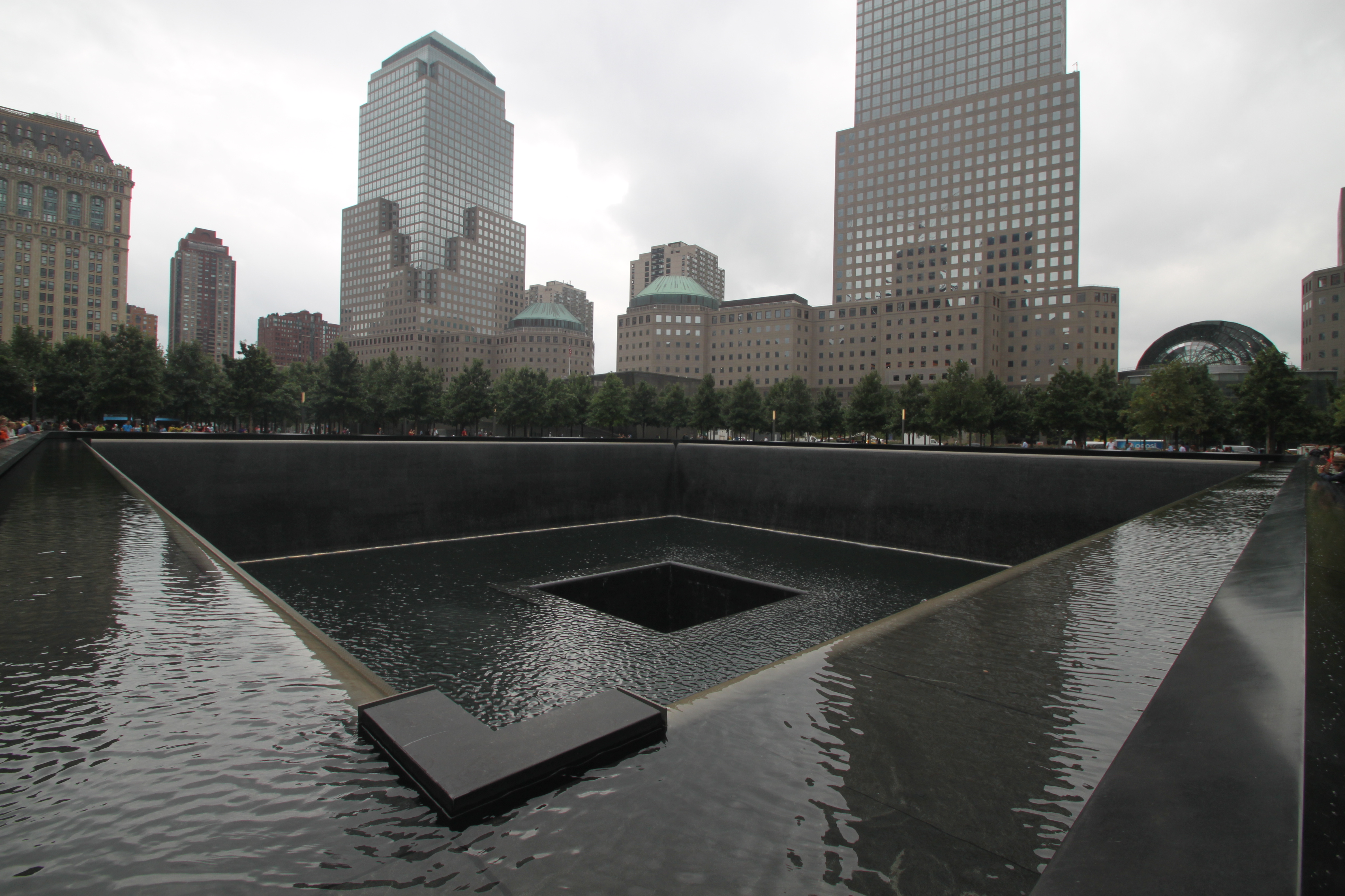 Deux énormes bassins de forme carrée occupent aujourd’hui l’emplacement exact des anciennes tours jumelles du World Trade Center. De l’eau coule sur les parois et se déverse ensuite dans un puits central dont on ne voit pas le fond.