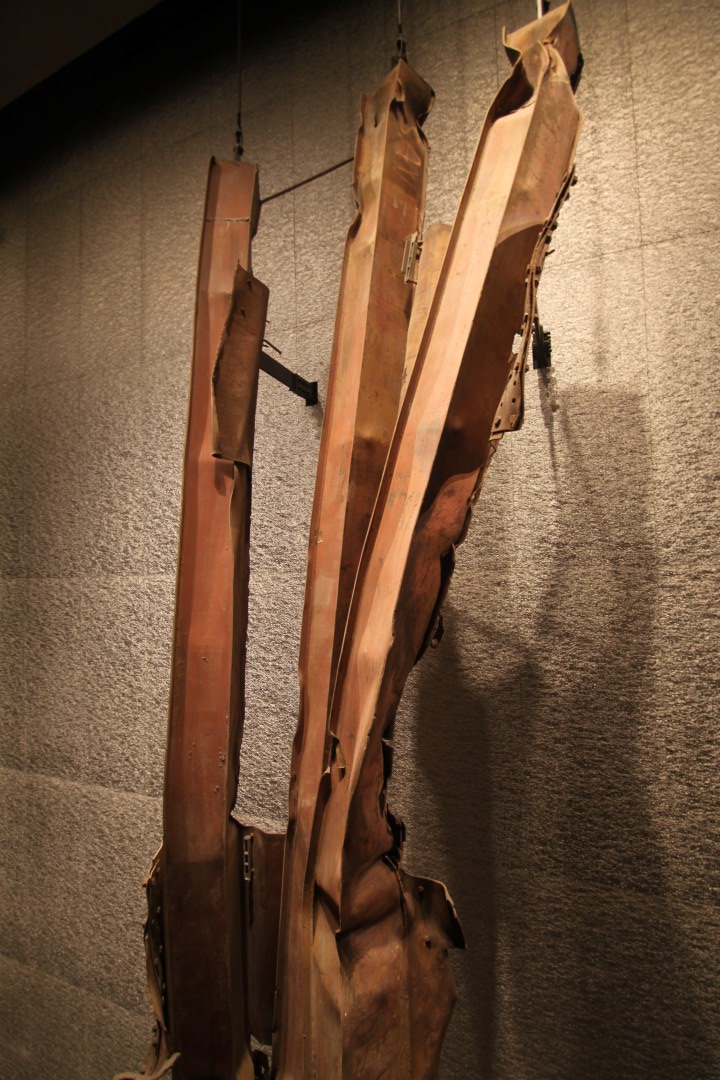 On trouve dans le musée de nombreux éléments récupérés sur le site. Par exemple, des poutres métalliques tordues par l’impact de l’un des deux avions: