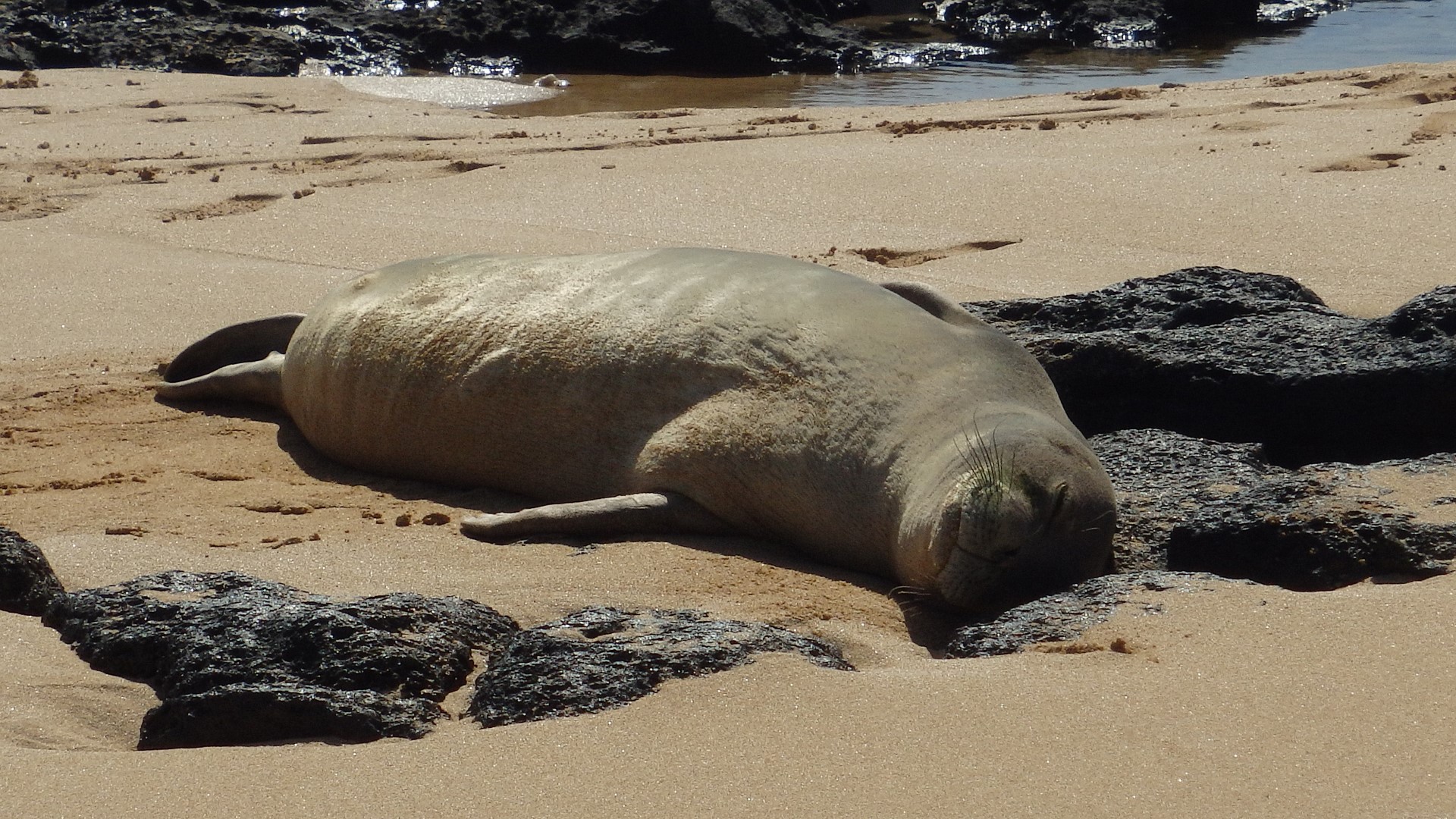 Nous y avons fait une dernière baignade avant de repartir prendre l’avion. Et nous avons eu la chance d’observer des phoques moines qui se doraient la pilule: