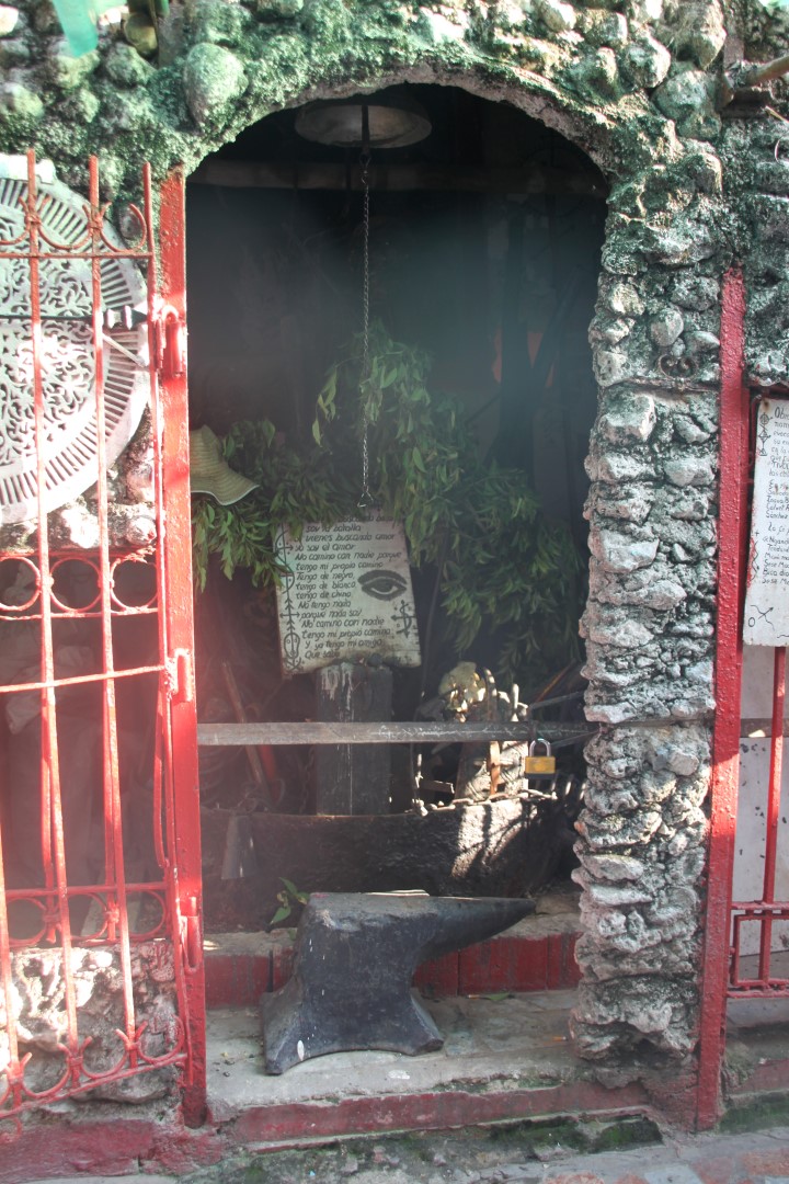 La religion Yoruba est dominée par un Dieu suprême, et des demi-dieux humains, appelés Orishás. Parmi eux, Oggún un dieu guerrier et forgeron qui a comme attribut le fer. Nous sommes tombés dans le Callejon de Hamel sur un autel qui lui était dédié, avec un chaudron et une enclume: