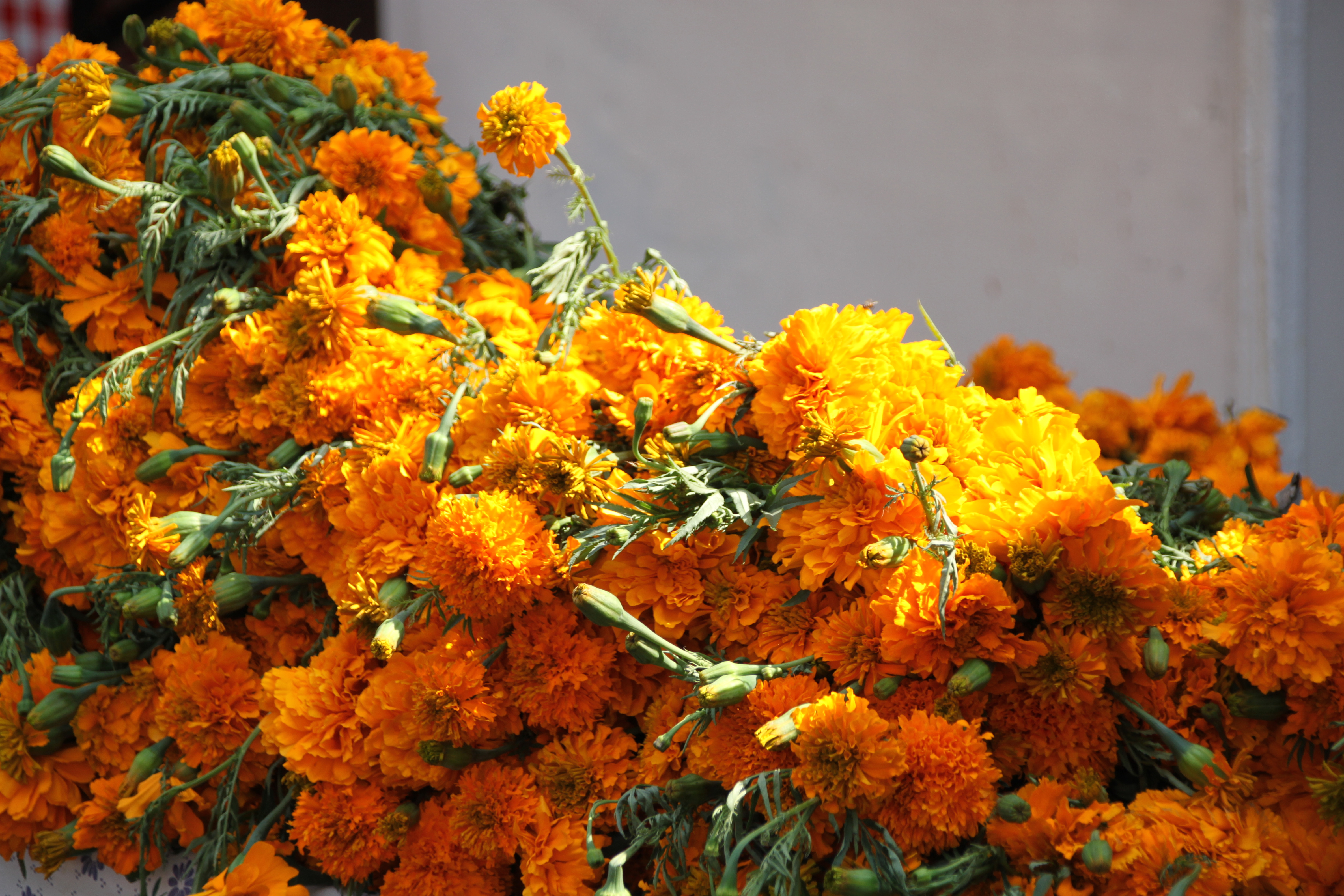- des fleurs, en particulier des œillets d’Inde jaune ou orange (cempasúchil), qui peuvent être accrochées en colliers ou sur un arc au-dessus de l’autel, ou être semées de l’autel jusqu’à la porte de la maison pour guider l’âme du défunt;