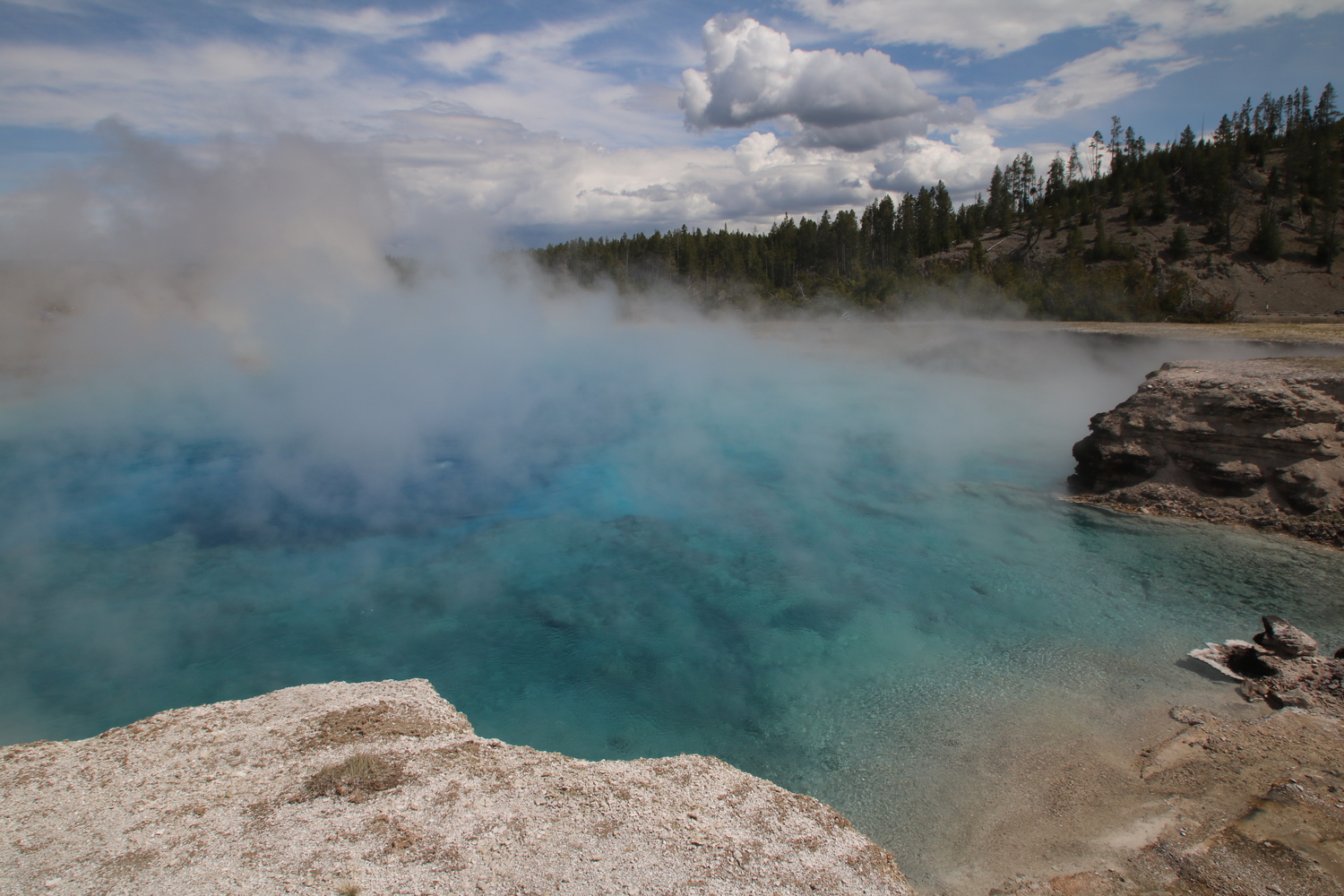 Après quoi, nous nous garons ensuite (péniblement, car il y a foule) au parking du Midway Geyser Bassin, qui accueille l’emblématique Grand Prismatic Spring. Nous passons d’abord l’Excelsior Geyser, une source chaude jaillissant à 93°C (jusqu’en 1890, c’était un geyser actif atteignant 91 mètres de hauteur, puis un effondrement de sa cheminée en fit une simple source). Les vapeurs se dégagent pour laisser voir un bassin d’un bleu incroyablement intense :